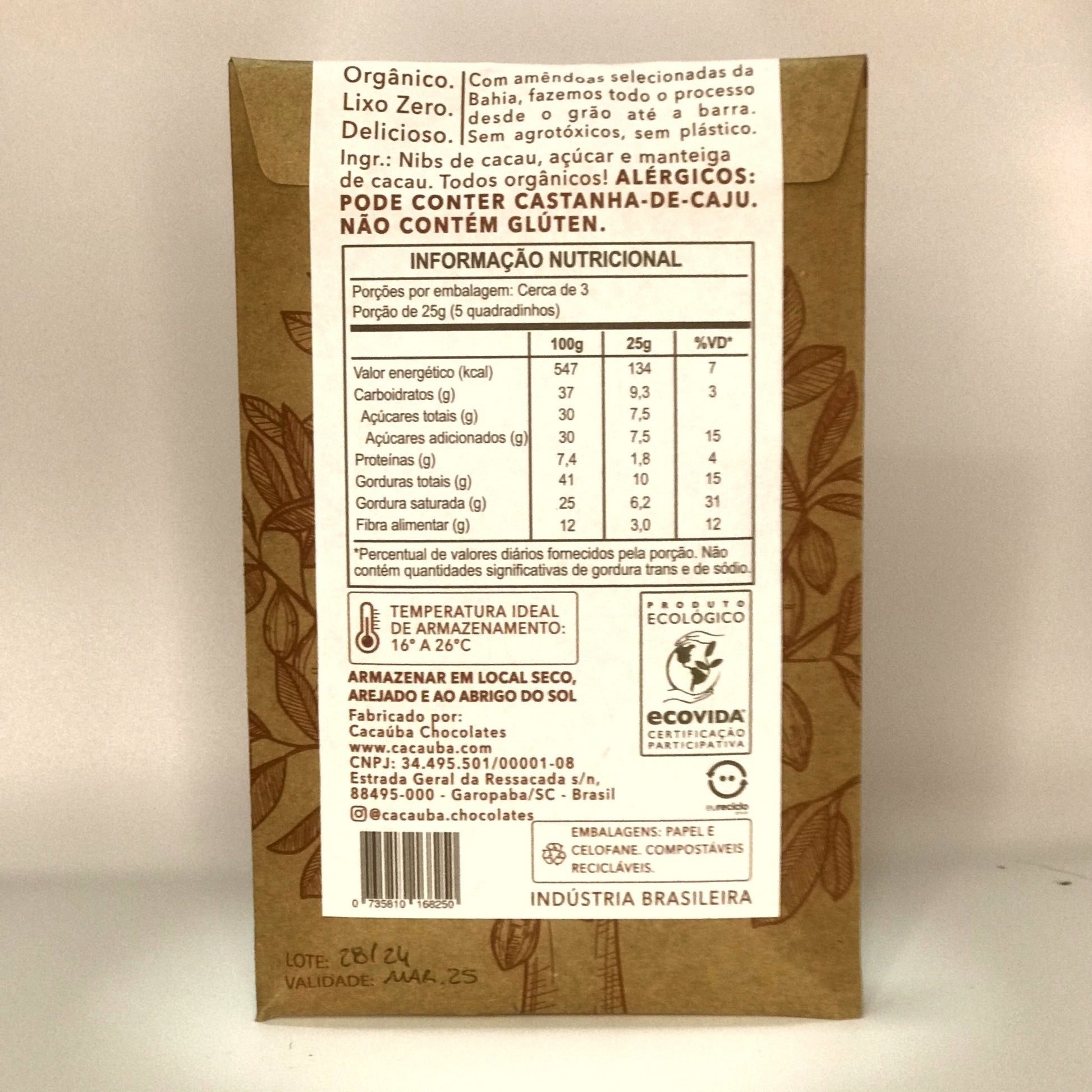 Um chocolate com personalidade, feito com cacau, açúcar e manteiga de cacau. Tudo orgânico! Com amêndoas selecionadas do sul da Bahia, fazemos todo o processo desde o grão até a barra. Puro sabor e saúde, para saborear ao natural ou elevar suas receitas! *Envio Lixo Zero